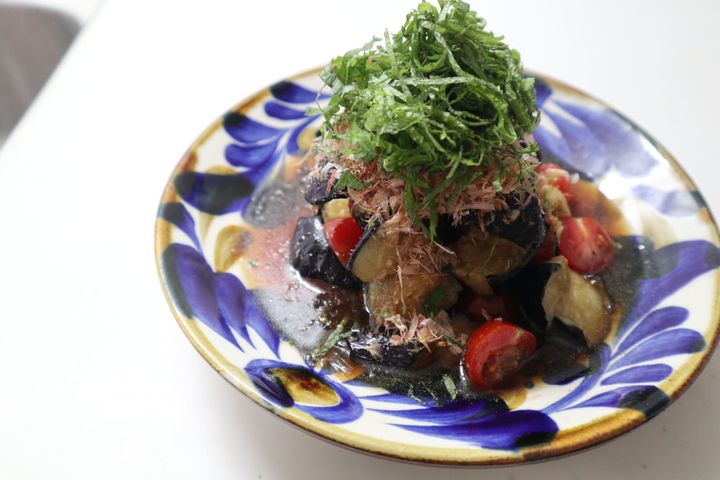 2.1にミニトマトを加えて混ぜる。器に盛り付けて鰹節と大葉をのせる。