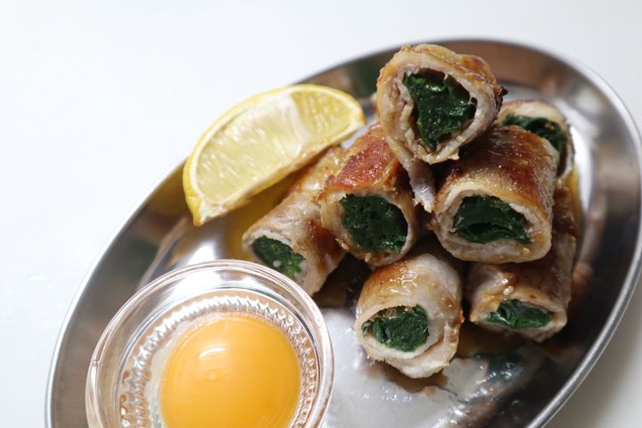 ニラの肉巻きを卵黄に絡めて召し上げれ!スタミナのあるがっつんとした1品は、ビールにもぴったり!