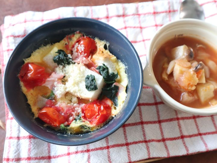 1.スープカップにAをいれて、混ぜる。食パン、ベーコン、ミニトマト、ほうれん草を加える。