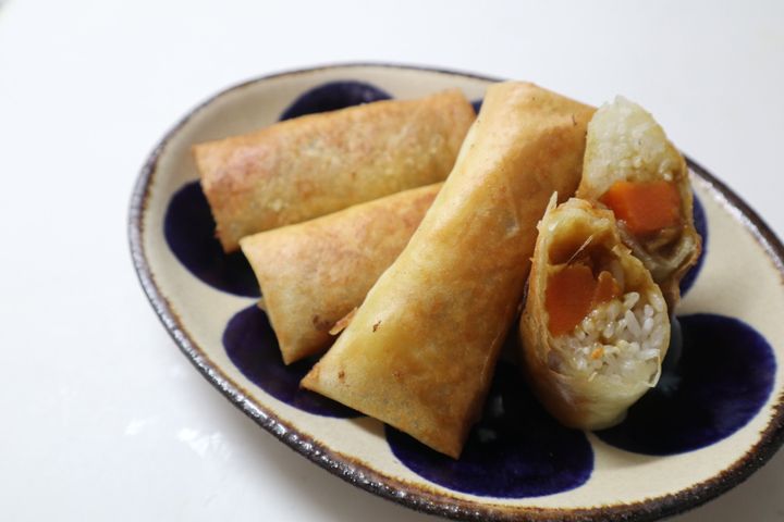 1.春巻きの皮にごはん、カレー、チーズをのせてまく。