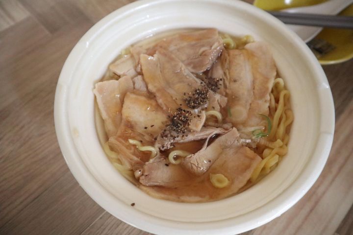 電子レンジで加熱したら、やけどしないように気を付けてスープに麺や具材をダイブさせます!
