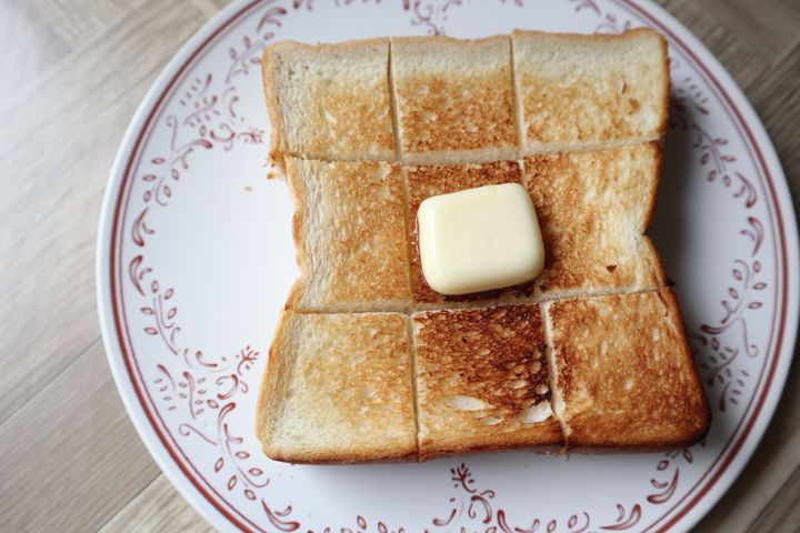 こんがり焼き色がついたら、トースターを止めてバターをのせて余熱でバターを溶かします。