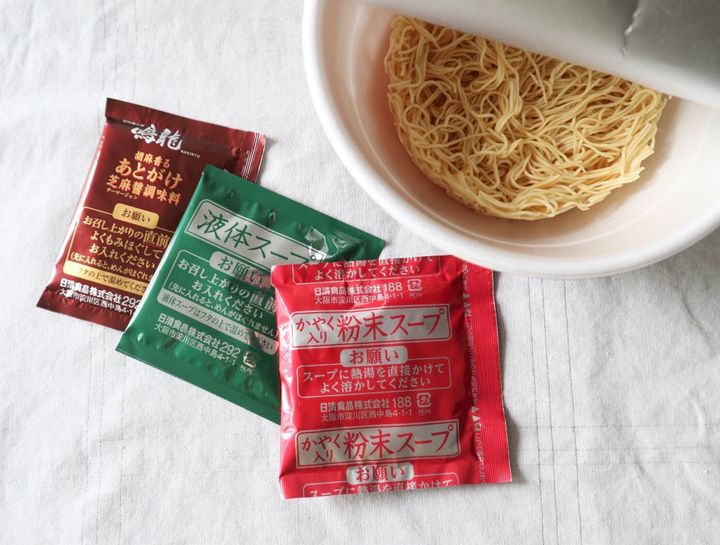 内容は、ノンフライ麺、かやく入り粉末スープ、液体スープ、胡麻香るあとがけ芝麻醤調味料です。