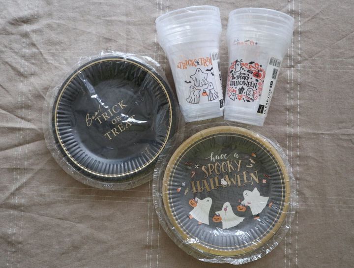 使い捨てのカップと紙皿各110円(税込)パーティーの時は、片付けを考えると使い捨てが断然楽!テーブルクロスがオレンジなので色を控えた大人可愛いデザインのものを選びましたよ。