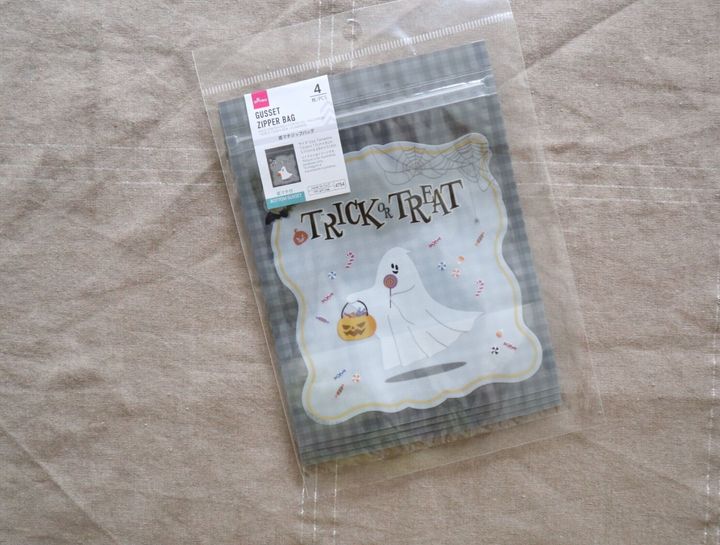 ゴーストジップバッグ110円(税込)ジッパータイプのマチ付きギフトバッグ。優しいグレーの色味も可愛いっ。