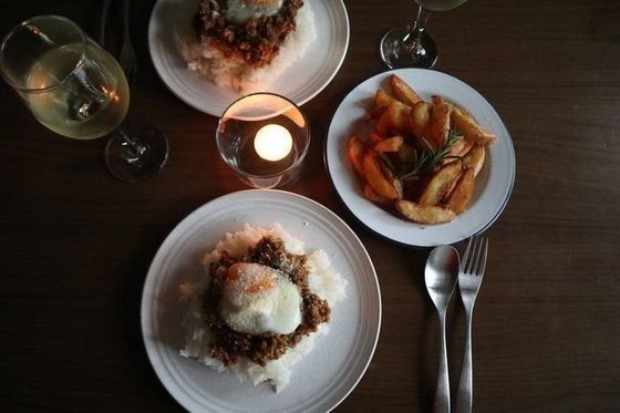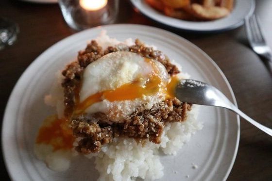 キーマカレーの上にとろとろの半熟卵をのせて。