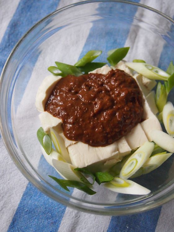 豆腐、ネギの上に【麻婆豆腐醤】をのせて、レンジで加熱して混ぜれば完成。