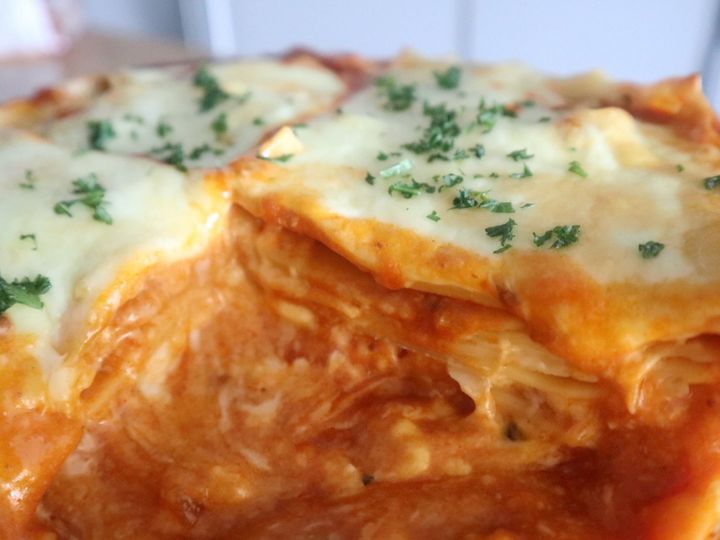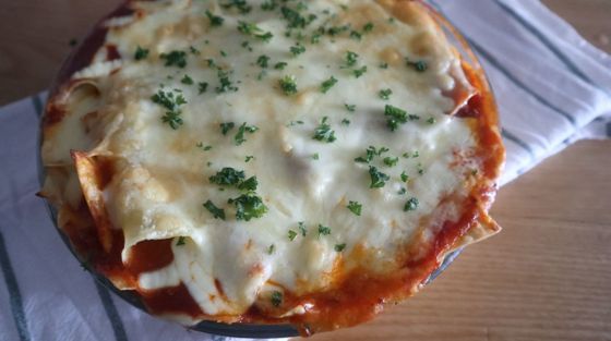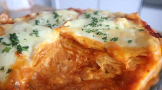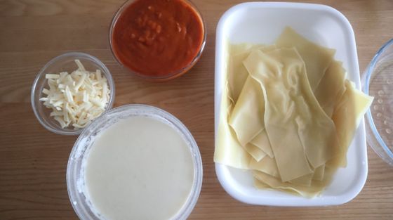 耐熱皿に、ホワイトソース、ラザニア、ミートソース、ラザニアを重ねていき何度か繰り返したら、チーズをかけてオーブンでグリルします。