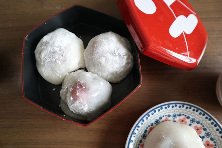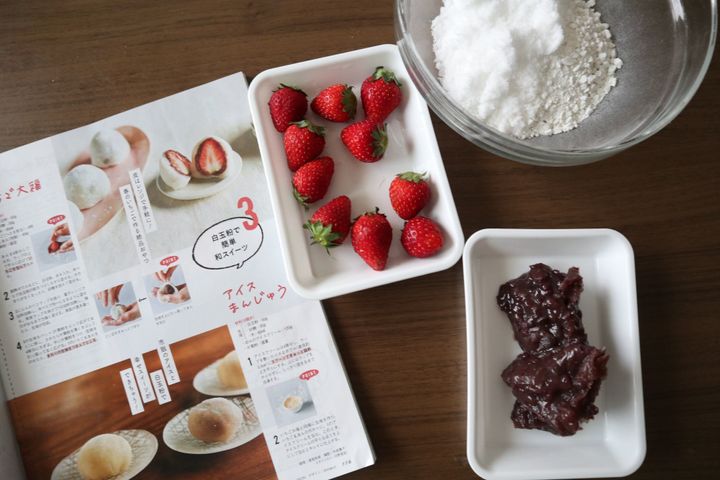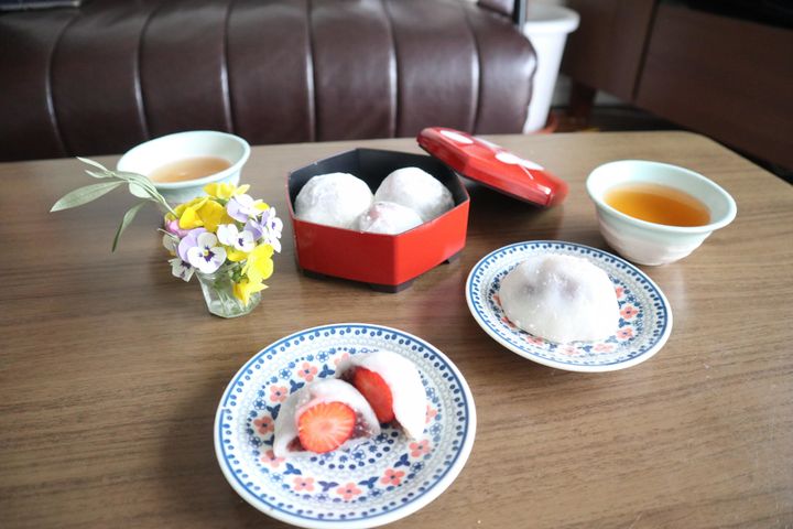 数年前に買った3COINSのお重にイチゴ大福を入れて、パパの夕食後のおデザに。