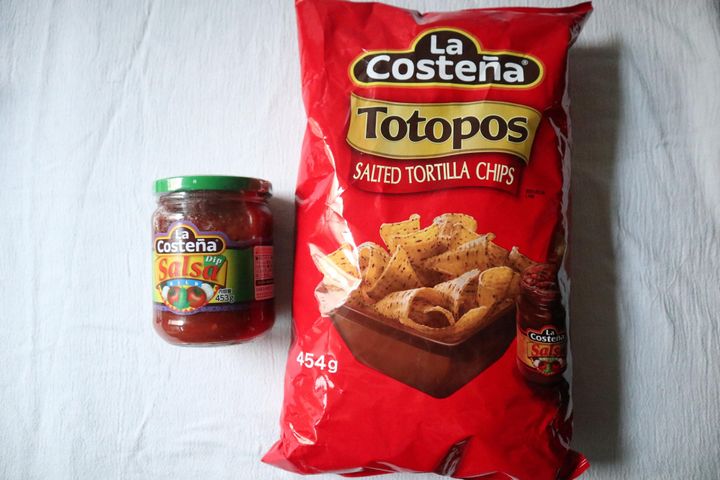 カルディだと違うメーカーですがサルサは340g348円、タコスチップスは120g270円です。