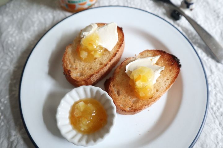 バゲットの上に柑橘のジャムとクリチをのせて。