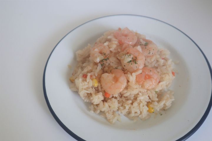 野菜と魚介の旨みたっぷりのピラフにぷりぷりの海老がのっています!