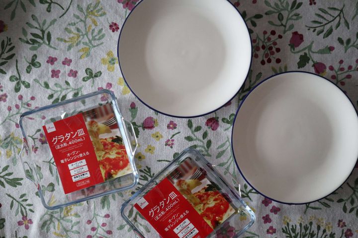 同じ大きさ、対応家電、サイズなのに200円のグラタン皿もあり、じっくりと眺めて100円の方を購入。違いは100円の方がほんのり青みがかっていて、200円の方は透明というくらいです。