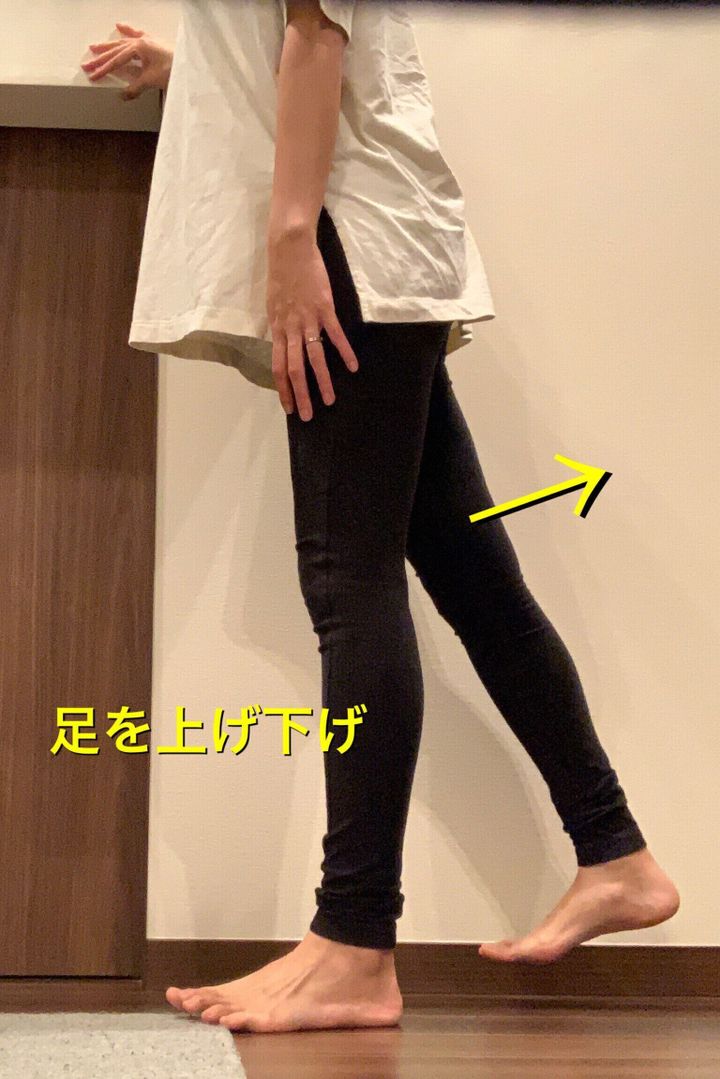 まっすぐ立って、片脚を後ろに上げ下げします。