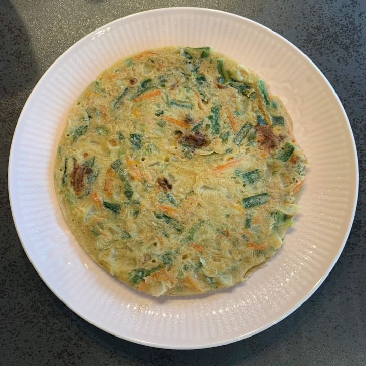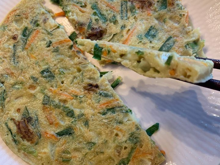 4種の野菜(タマネギ、ネギ、にんじん、ニラ)とイカが入ったシンプルなチヂミ。
