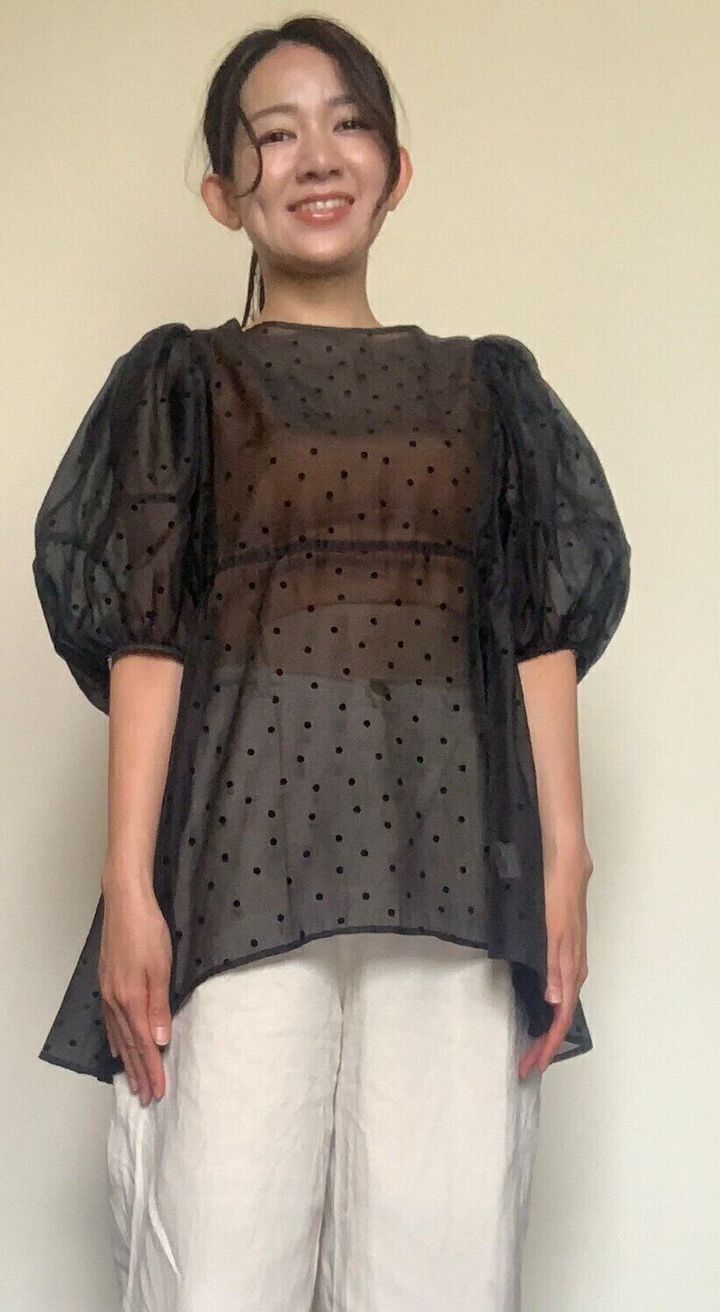 短め丈で、お腹部分がほどよく露出するので、シアー系のインナーの下に着るのもおすすめ。