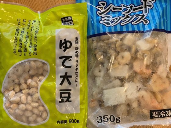 「冷凍ゆで大豆」165円(税抜)、「シーフードミックス」348円(税抜)。