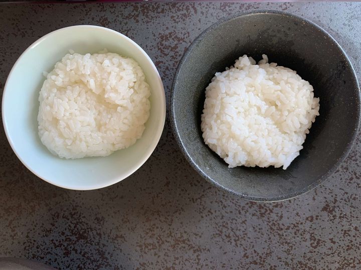 ごはんの量を多く見せて、満足感アップさせるには、小さめのお茶碗が良いです。大きな丼茶碗を使っている場合は、小ぶりなサイズにチェンジ。