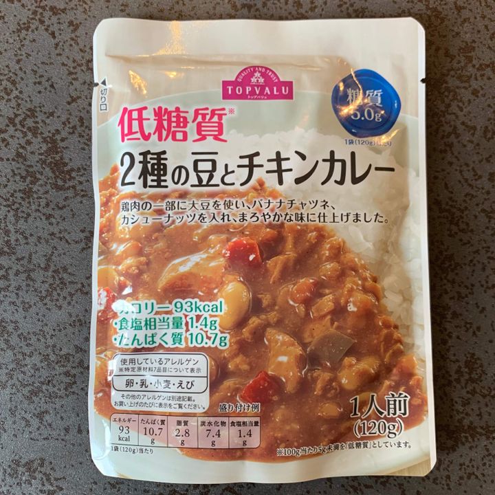 「トップバリュ 低糖質 2種の豆とチキンのカレー」。