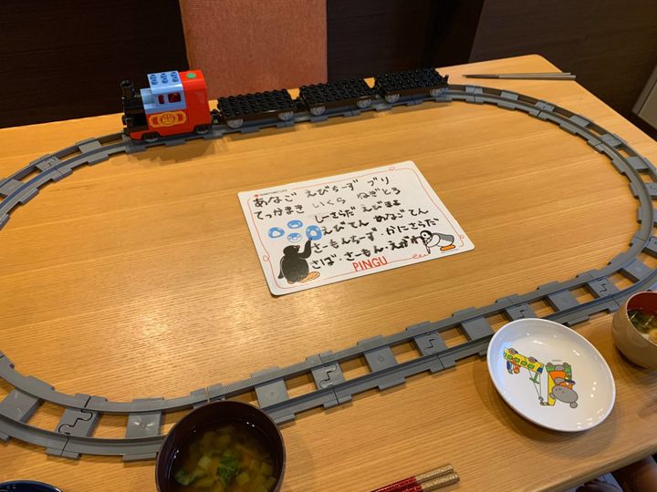 レゴデュプロのトレインセットを使って、レーンを作りました。プラレールでも出来ますが、少し安定性に欠けたので、幅があって安定するレゴデュプロがオススメです。貨物を乗せる部分にお皿を乗せて、出発進行!