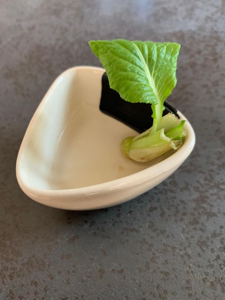 根の部分を切り、水に浸けておきました。3~4日くらいしたら、可愛い葉が出てきました。あまりに可愛らしいので、観葉植物として良いかもしれません。ですが、ここから大きな成長がなく、食べるタイミングはよくわからぬまま、インテリアと化しております。