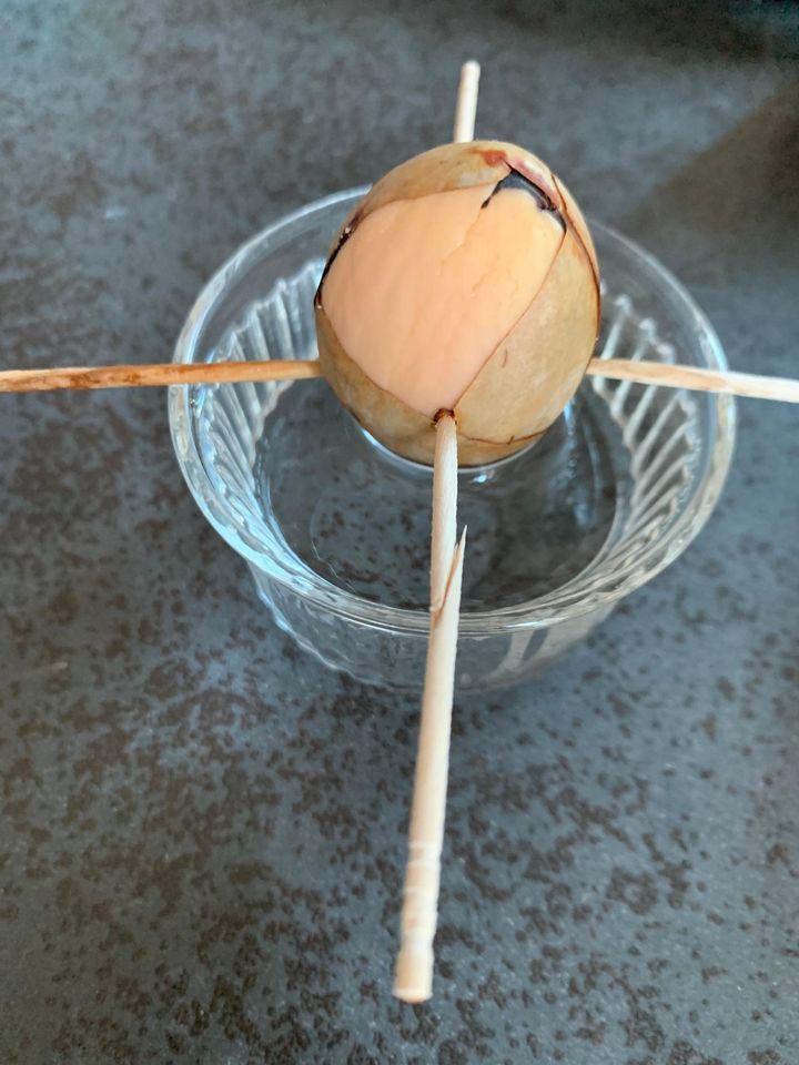 種をよく洗い、竹串に刺して、下の部分を水に浸けました。