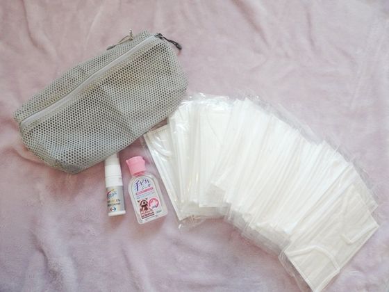 個包装のマスク40枚、アルコール消毒液、マスク抗菌スプレーを入れてみました!