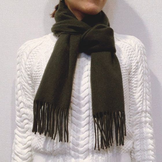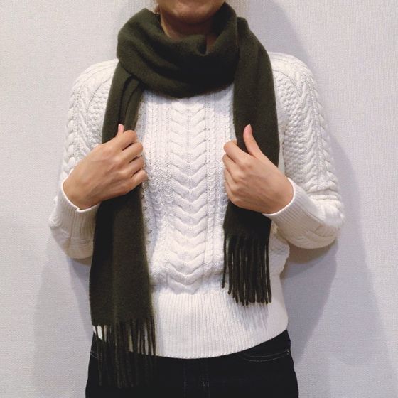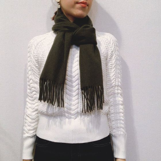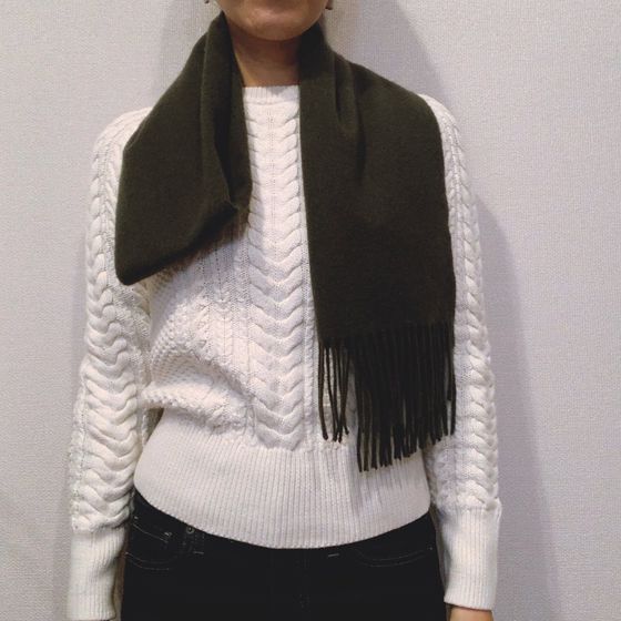 首に隙間ができないのでとてもあたたかいポット巻き。Vネックなどの胸元が開いたニットに合わせたいですね!