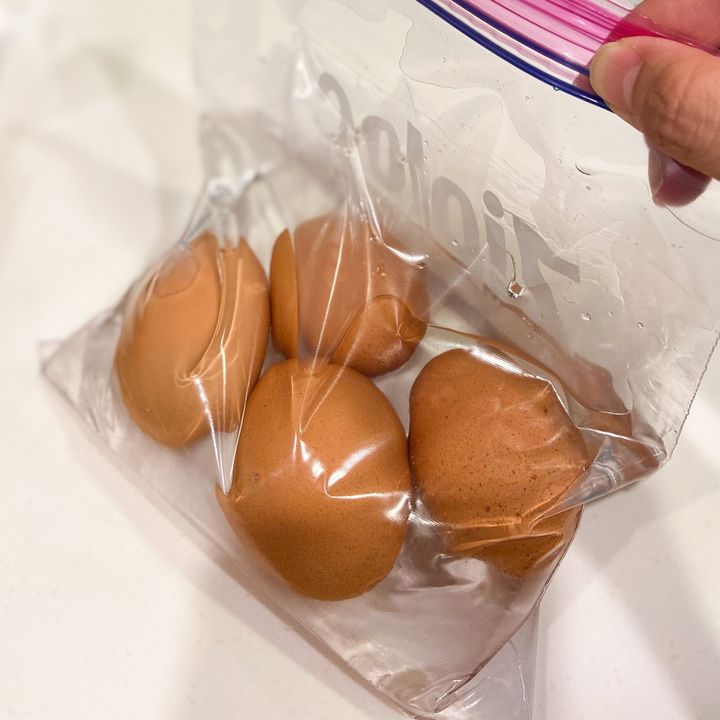 保存袋ごとタッパーへ入れれば、卵がまんべんなく食塩水に浸かります。