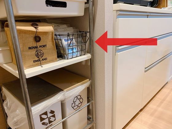 我が家では、このカゴをキッチンの棚に置いています。以前は、洗面所に置いてあったのですが、ズボラな筆者は、飲むときに出してきた薬の袋を、飲んだ後もキッチンに置きっ放しにしてなかなかしまわない...ということが度々あったため、キッチンへ移動しました。