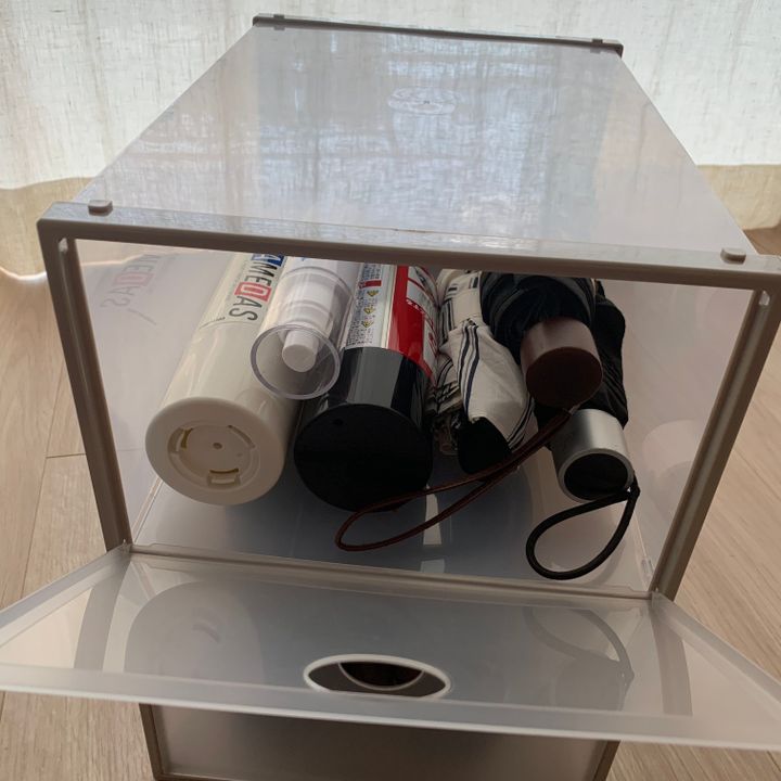 そしてこのシューズボックス、靴はもちろんのこと、玄関周りの小物収納にピッタリなんです。我が家では、折り畳み傘や、スプレー類をまとめて収納。取り出すときは蓋をパカっと開けるだけなので楽々です。