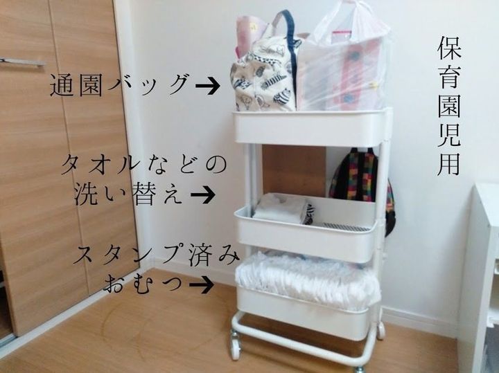 保育園用のものはワゴンに集約させておくことで、わたしも翌日の準備がとてもしやすいです。