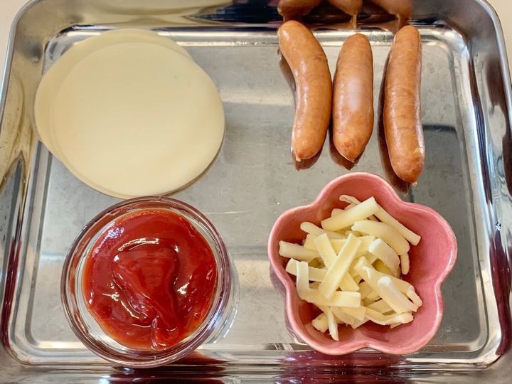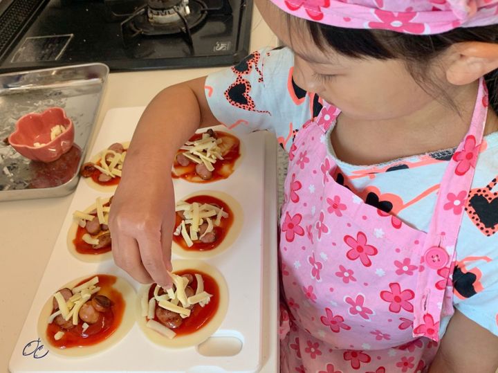 ウィンナーを焼けば、後は乗せるだけととても簡単なので子どもに作ってもらいました。