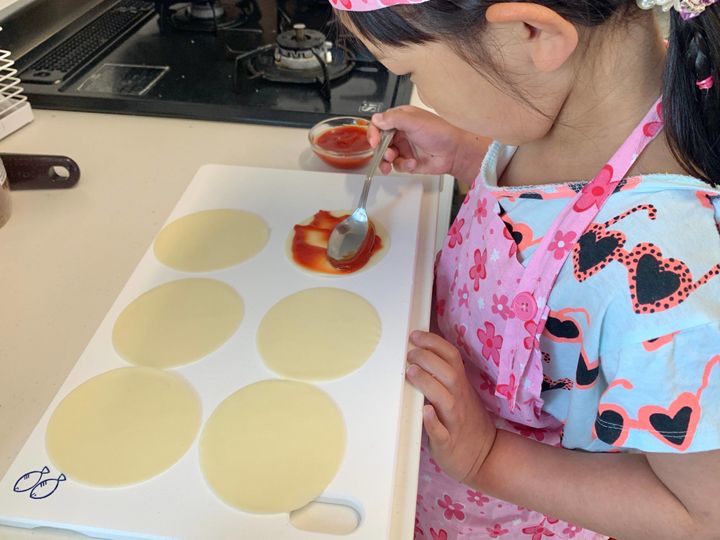 餃子の皮にケチャップを薄く塗ります。