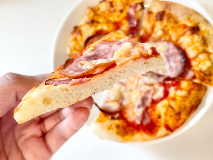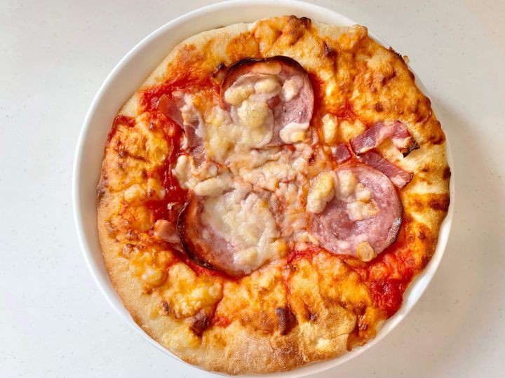 熟成されたもっちり食感の生地に、コクのあるトマトソース、ショルダーベーコン、ソフトサラミソーセージ、チーズがのったピザです。