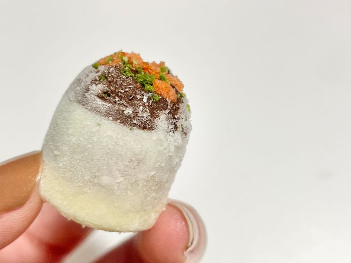 生地をバニラアイス、ソースをチョコアイス、青のりを抹茶顆粒、紅ショウガをいちご顆粒でたこ焼きに見立てています。
