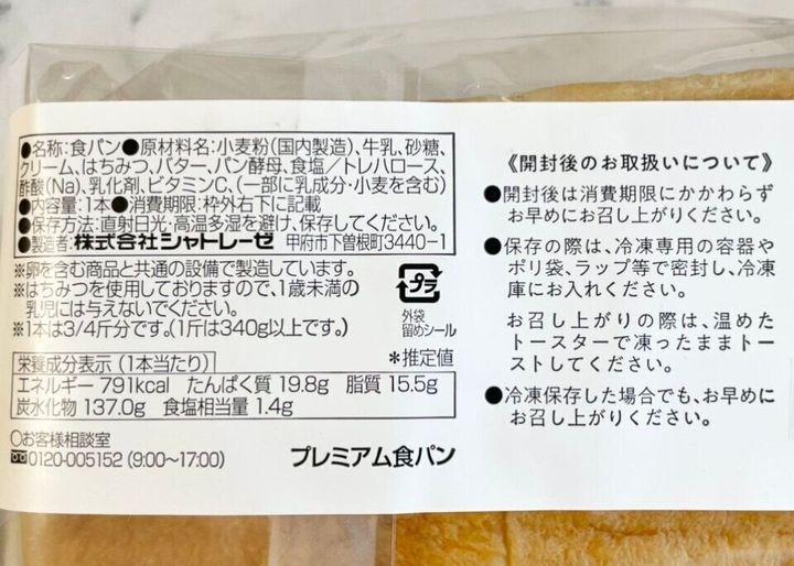 名称: 食パン●原材料は小麦粉(国内製造)、牛乳、砂糖、クリーム、はちみつ、バター、 パン酵母、食塩/トレハロース、酢酸(Na)、乳化剤、ビタミンC、 (一部に乳成分·小麦を含む)。