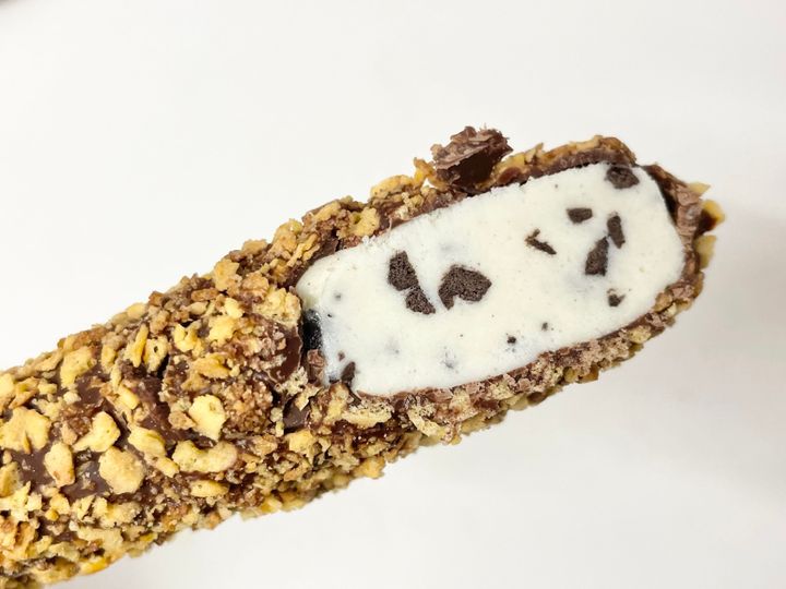 ココアクッキークランチ入りバニラアイスを、チョコレートでコーティングしています。