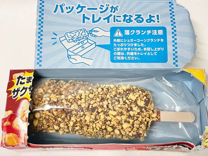開けると、外側についているシュガーコーンクランチがこぼれやすいため、外箱をトレイにすることができます。この発想畑らしい!
