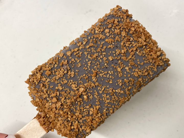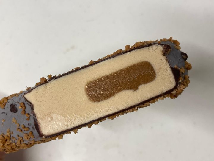 粒状のクランチがたっぷりとチョコレートにトッピングされていて、塩キャラメルアイスの中にキャラメルソースが包み込まれています。