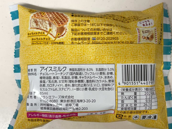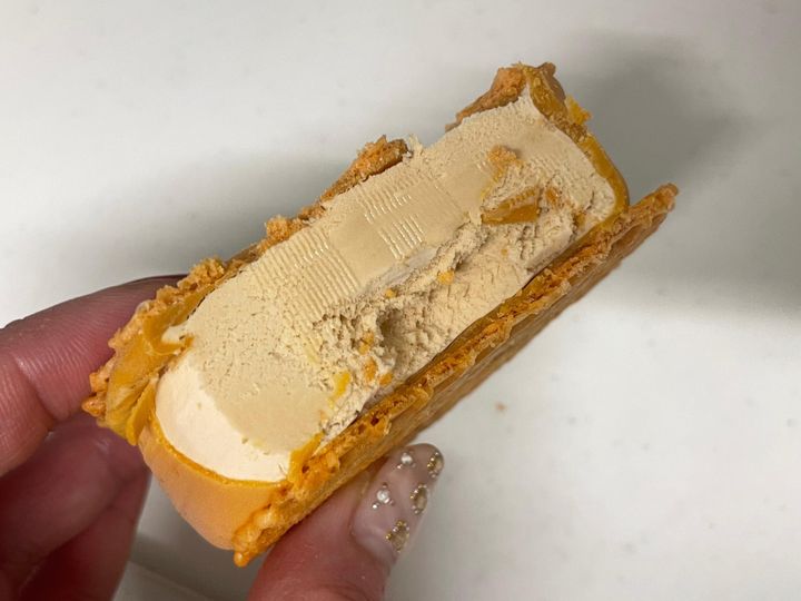 濃厚なキャラメルアイスをミルキーでなめらかなキャラメルチョコレートでコーティング、さらにサクサクとした食感のワッフルでサンドしたアイスになっています。