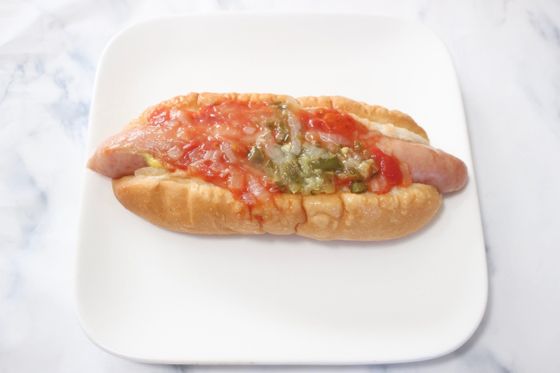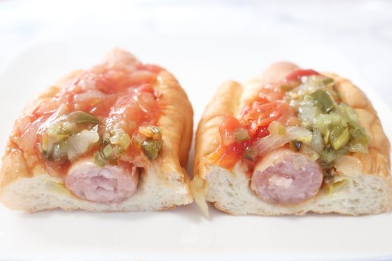 大きくパリッとジューシーでパンからはみ出すソーセージの上から、ダイス状にカットしたトマト・オニオン・ピクルスを合わせ、味のアクセントにハラペーニョソースを効かせました。