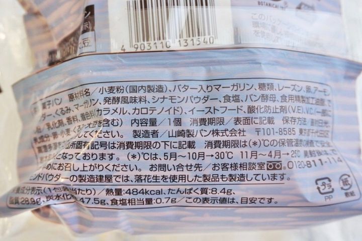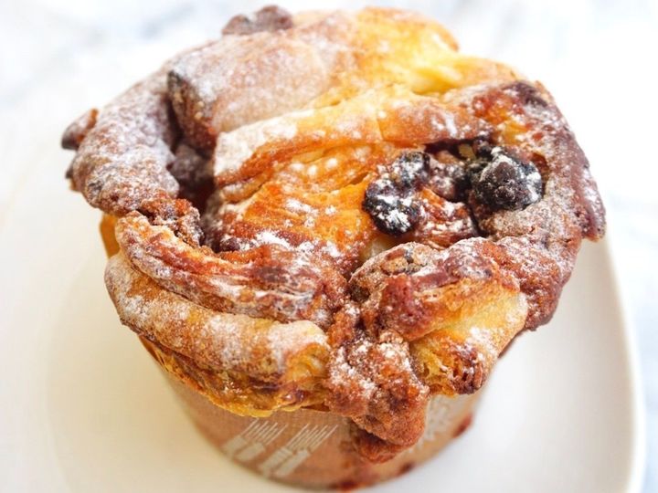 デニッシュ生地をマフィン型に流し焼き上げていて、シナモンフィリング、レーズン、くるみを巻き込んだパンになっています。