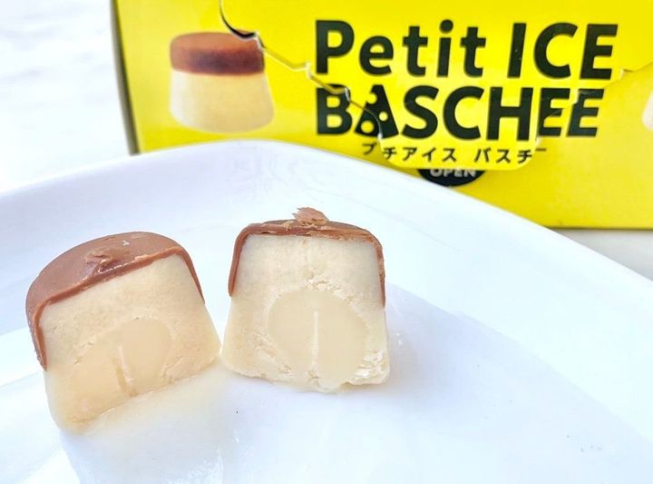 中心に濃厚チーズソースを入れた北海道産クリームチーズ使用のチーズアイスと、ほろ苦カラメルチョココーチングでバスチーを再現したひとくちアイスです。