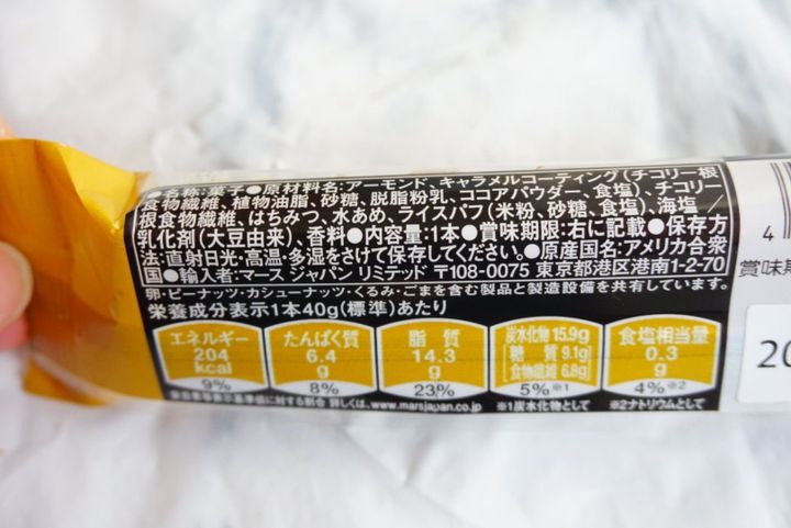 ナッツがゴロゴロ密集していて、下部分はチョコレートでコーティングされています。
