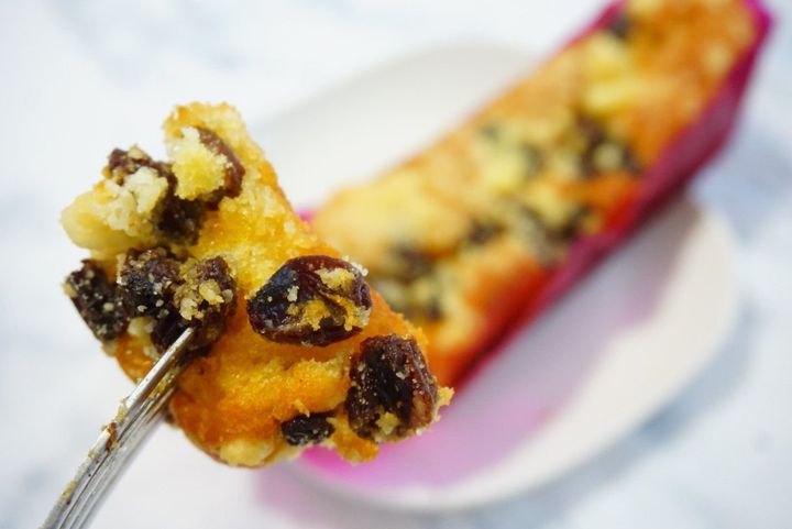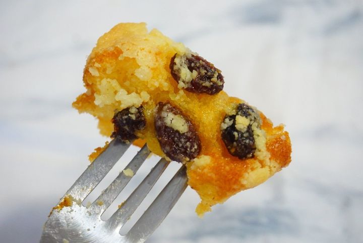 もっちりとしたバタースコッチ風生地に、ラム酒につけたラムレーズンとバタークランブルがトッピングされたケーキ。生地に練乳が入っており、濃厚なコクを感じる事ができます。