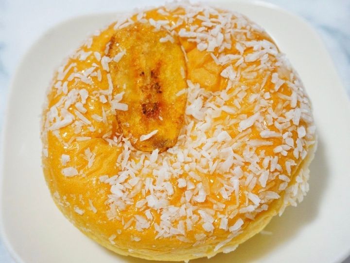 バナナクリームを包んだ生地にバナナチップをのせ焼き上げ、ココナッツをトッピングしたパンです。