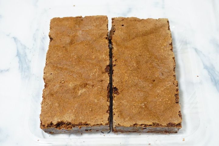 そのまま食べてももちろんおいしいんですが、ブラウニーを少し温めて、バニラアイスをのせて熱冷スイーツとして食べるのがおすすめ。