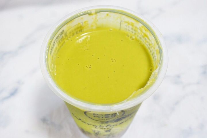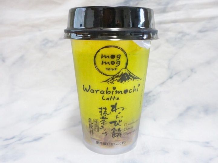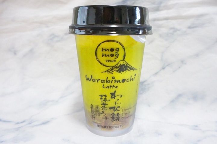 濃厚な抹茶ラテに、ぷるんとした食感のわらび餅が入ったドリンクです。