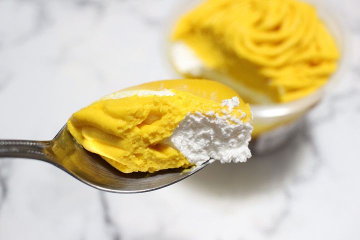 かぼちゃペースト入りのクリームだけまずは食べてみようとすくったらプリンとの間にホイップクリームが入っていました。